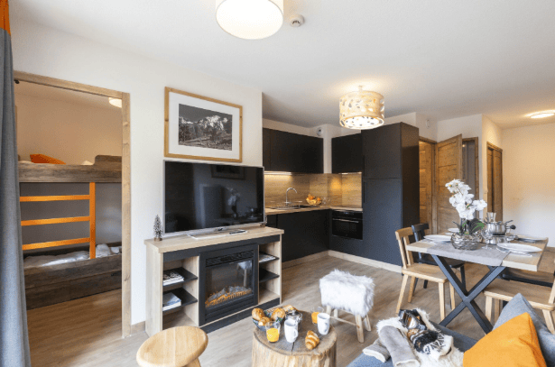 with sofa bed for 2 persons, Flat screen TV with TNT, Ambient fireplace